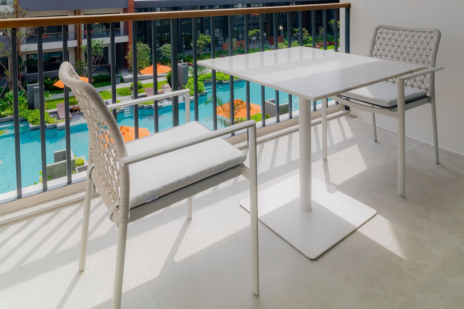 Die 110 qm große Wohnung liegt im 3. Obergeschoss, bequem per Aufzug erreichbar, und bietet zwei Balkone mit Blick auf den beeindruckenden Pool. Aufgeteilt ist sie in ein großzügiges Wohnzimmer, zwei Schlafzimmer mit Einbauschränken (Master mit Bad en Suite), ein weiteres Bad, eine moderne Einbauküche sowie einen Hauswirtschaftsraum. Die Wohnung ist ganz neu möbliert (April 2026), so dass Sie einfach mit Ihrem Koffer einziehen können.